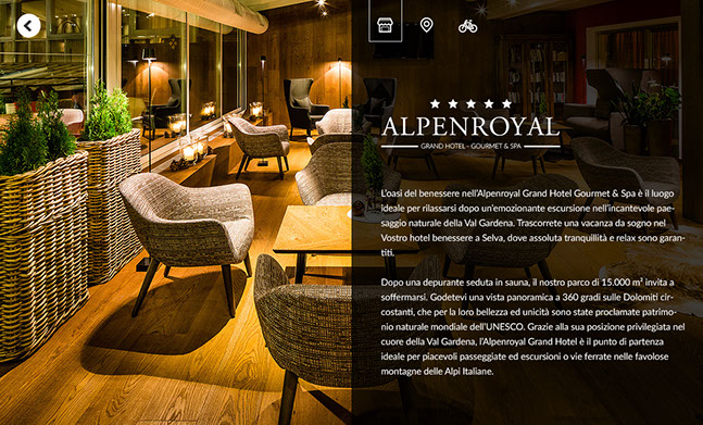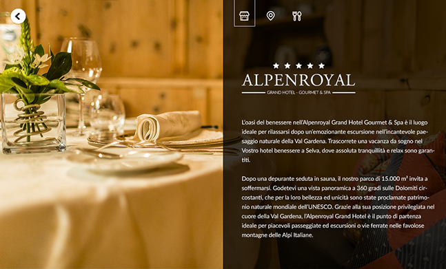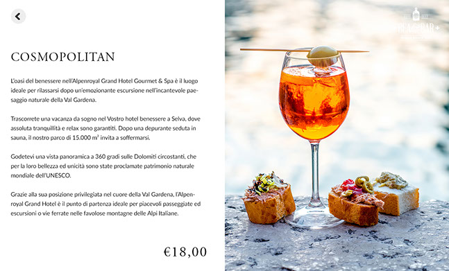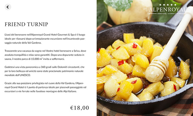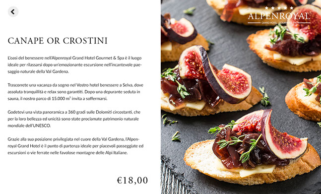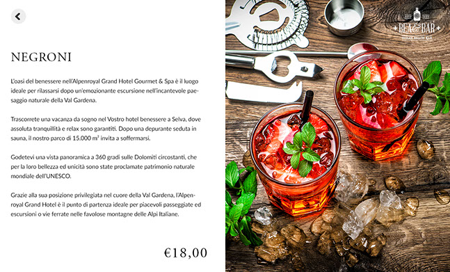 Il Menù digitale di ItaliaGustus entra nelle logiche tradizionali delle prestazioni commerciali e ne scardina alcune dinamiche rinnovandole. È un’applicazione elegante, smart, dinamica e multilingua, pensata per Enoteche, Bar, Ristoranti, Hotel, Spa. Di immediata navigazione può essere utilizzato in sostituzione ai classici cartacei. Una formula nuova e innovativa che rompe la monotonia. Una vetrina vivace, colorata, ricca di immagini, video e testi accattivanti che sono mostra di una storia: la tua storia, la tua azienda, i tuoi prodotti, i tuoi eventi. Un servizio rapido e sempre aggiornato che offre la possibilità ai tuoi clienti di vivere un’esperienza immersiva, unica e sempre diversa nel tuo locale!