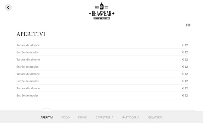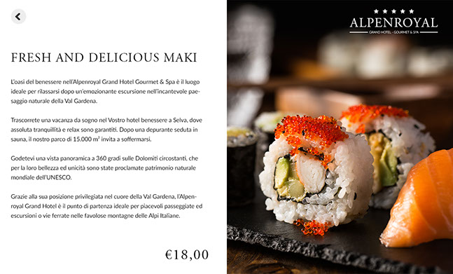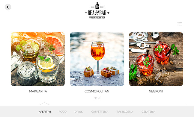 Menù digitale elegante, smart, dinamico e multilingua, facilmente consultabile dagli utenti del web o dai tuoi clienti. Il servizio rapido e sempre aggiornato, offre la possibilità ai tuoi acquirenti di vivere un’esperienza unica e sempre diversa rendendo immersivo l'ecosistema informativo del brand.